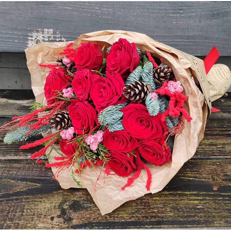 This Christmas bouquet with red roses, noble pine cones, and festive decor is a striking arrangement imbued with the atmosphere of winter magic. Velvety red roses lend a solemn and emotional depth to the bouquet, while fresh noble pine cones imbue it with a pine scent and a cozy feel. Natural pine cones and elegant Christmas ornaments emphasize the seasonal nature of the arrangement. This bouquet makes a stunning Christmas gift, creating a festive mood and adding a stylish accent to any interior.